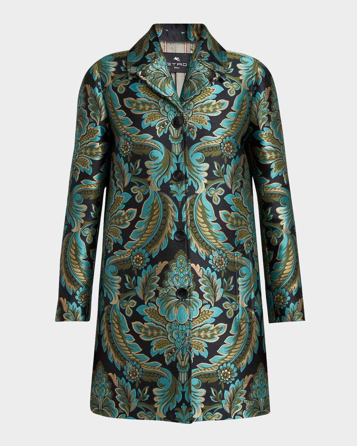 Designed in a striking floral jacquard, this top coat by Etro is expertly crafted for a tailored fit Notched collar; singlebreasted front Long sleeves Sideentry welt pockets Relaxed fit Hem falls above the knee Polyester/viscose/cotton Made in Italy