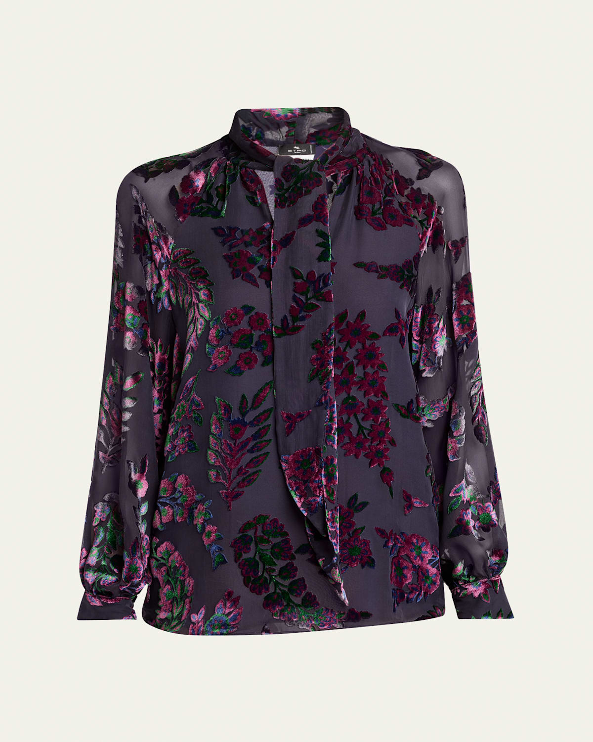 Etro velvet burnout blouse enhanced with a tie neckline Long sleeves with button cuffs Classic fit Hem falls to the hip Pullover style Viscose/silk Professional cleaning recommended Made in Italy