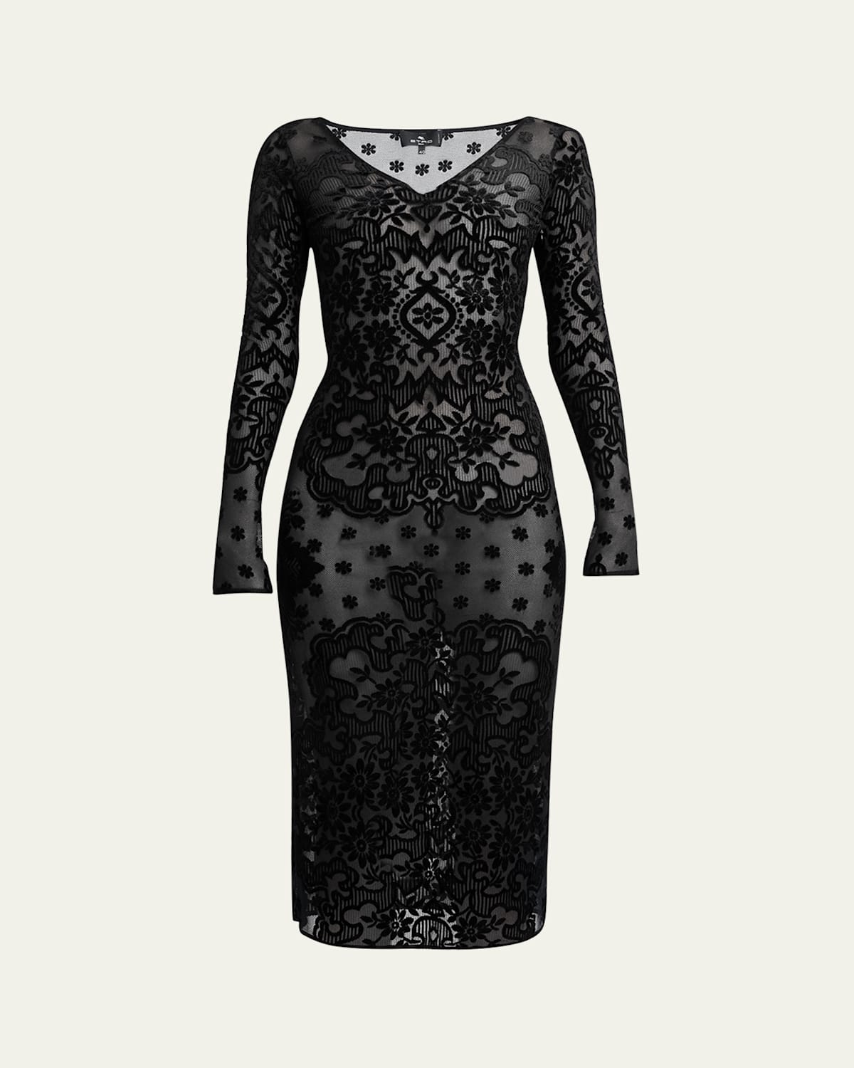 Etro paisley velvet dress V neckline Long sleeves Sheath silhouette Midi length Slipover style Viscose/nylon/polyamide Dry clean Made in Italy