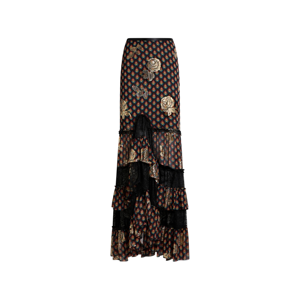 black and multicolour roses motif tie detail lace trim ruffled detail layered design