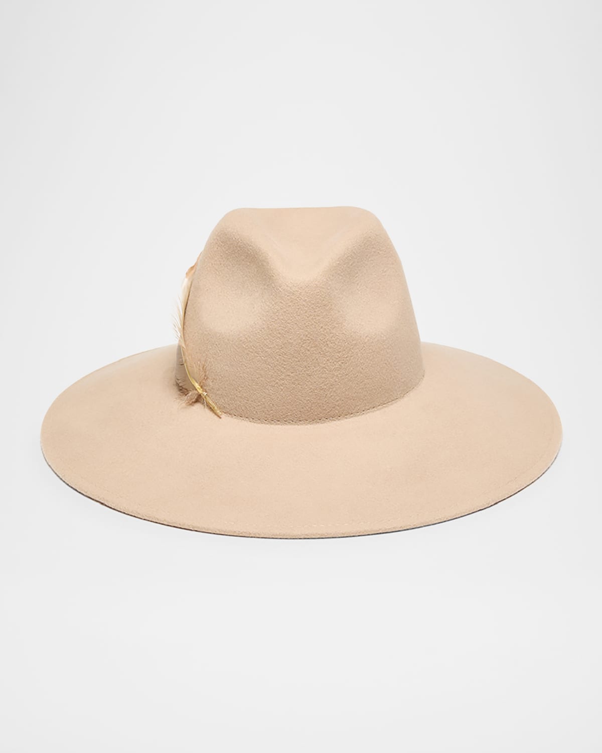 Eugenia Kim "Emmanuelle" wool fedora with feather trim Pinched crown Flat, wide brim Item Weight (Lbs.): 0.4 Wool Spot clean Trim: Feather Imported