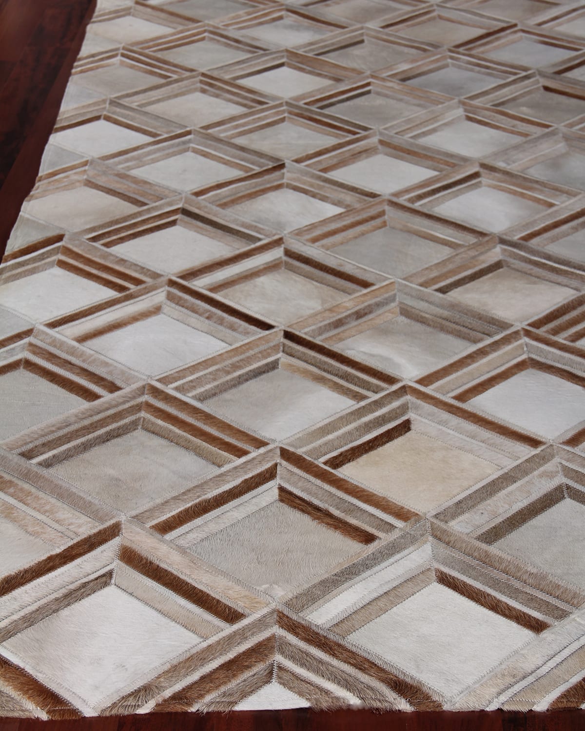 The McCall hairhide rug-an optical work of art created by master weavers. Handstitched dyed hairhide (India). Felt backing. Size is approximate. Imported.