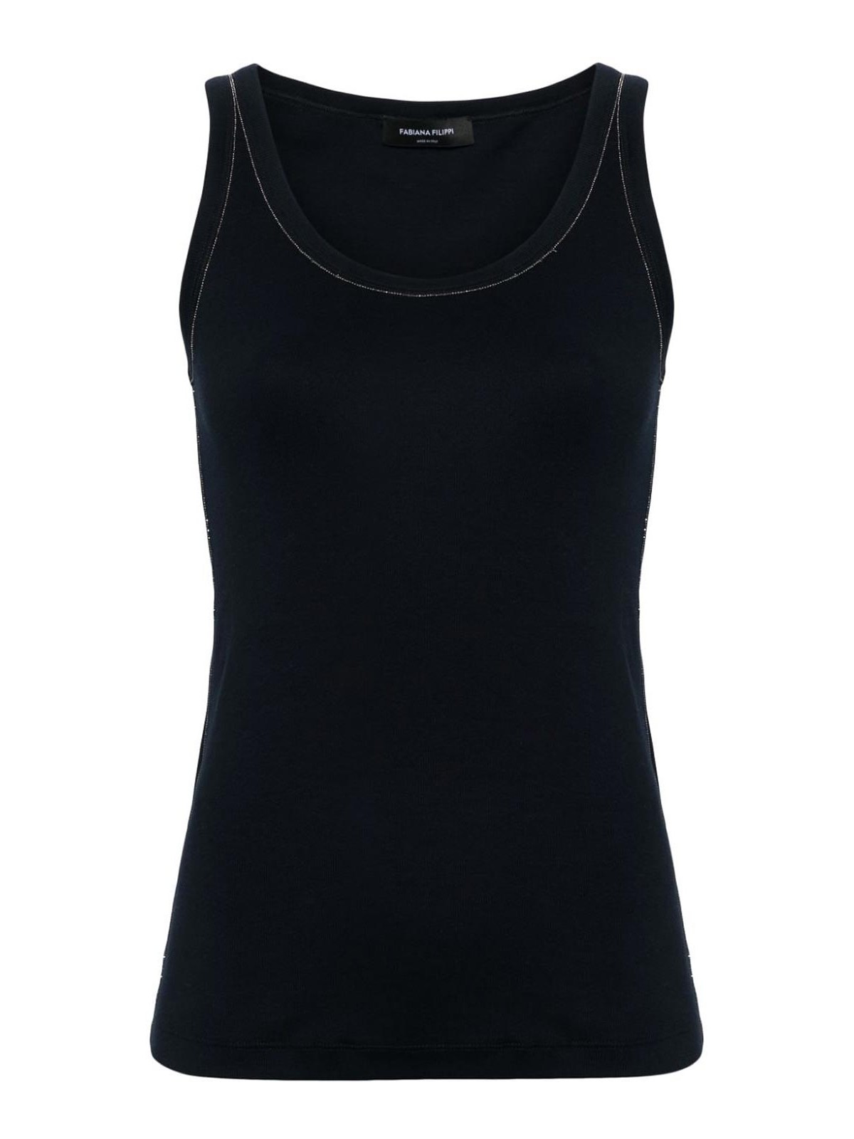 Bordure perlée à fines côtes en coton stretch bleu marine, col rond, ourlet droit sans manches