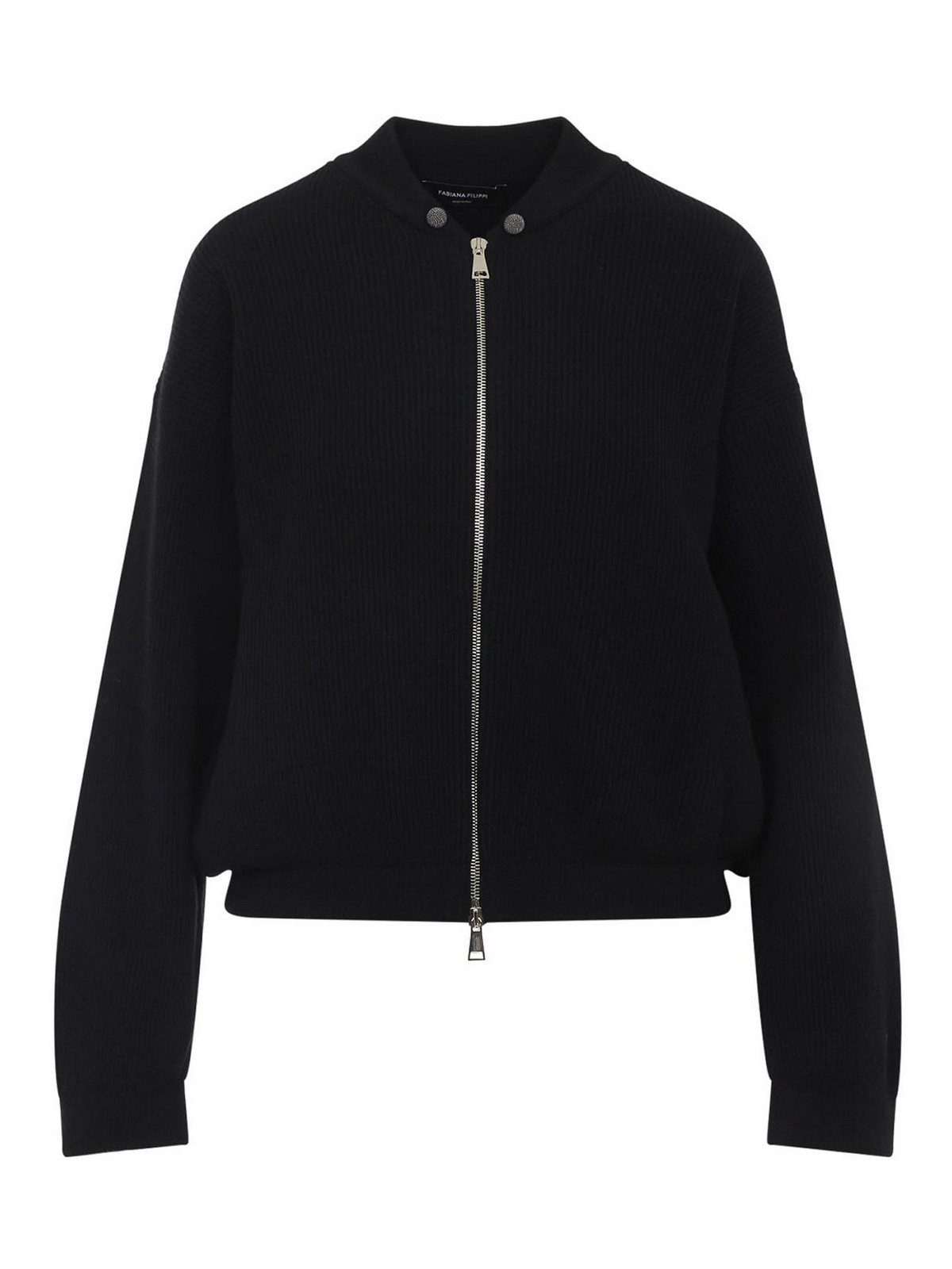 Veste noire Fabiana Filippi confectionnée en tissu côtelé et mélangé noir, encolure ronde, signature sur les deux côtés, fermeture éclair, manches longues, bords côtelés fins