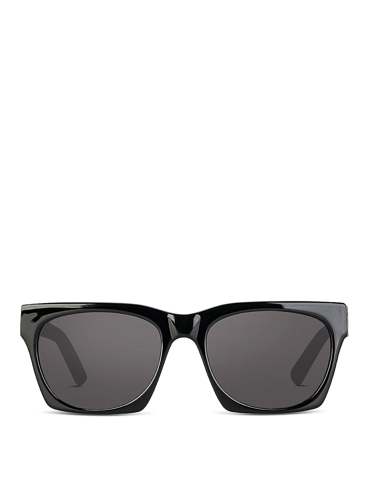 Lunettes de soleil caractérisées par un design audacieux et une forme rectangulaire adaptée, de larges verres noirs de forme rectangulaire.
