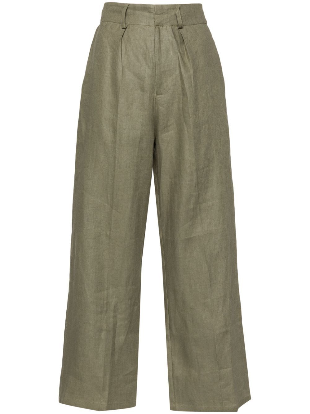 olive green linen/flax belt loops pleat detailing two side inset pockets pressed crease straight leg rear elasticated waistband concealed front button, hook and zip fastening We've partnered with Good On You - an independent agency that rates how brands perform in relation to their impact on the planet, people and animals, with a multi-criteria rating simplified to a five points scale. In order to be awarded our conscious label, larger brands need to score a minimum of four out of five ('Good'), while smaller brands must score at least three out of five ('It's A Start'). This item comes from a brand rated three out of five ('It's A Start') by Good on You at the time it was added on FARFETCH. Please note, this is a brand-level rating and does not guarantee that this product is made with conscious materials. This item contains at least 50% materials which are certified or widely recognised as having a lower environmental impact through production and/or manufacturing processes that reduce water consumption and the use of harmful chemicals, or re-use by-products of the production process. Learn more about what makes a product Conscious on our Conscious Criteria page