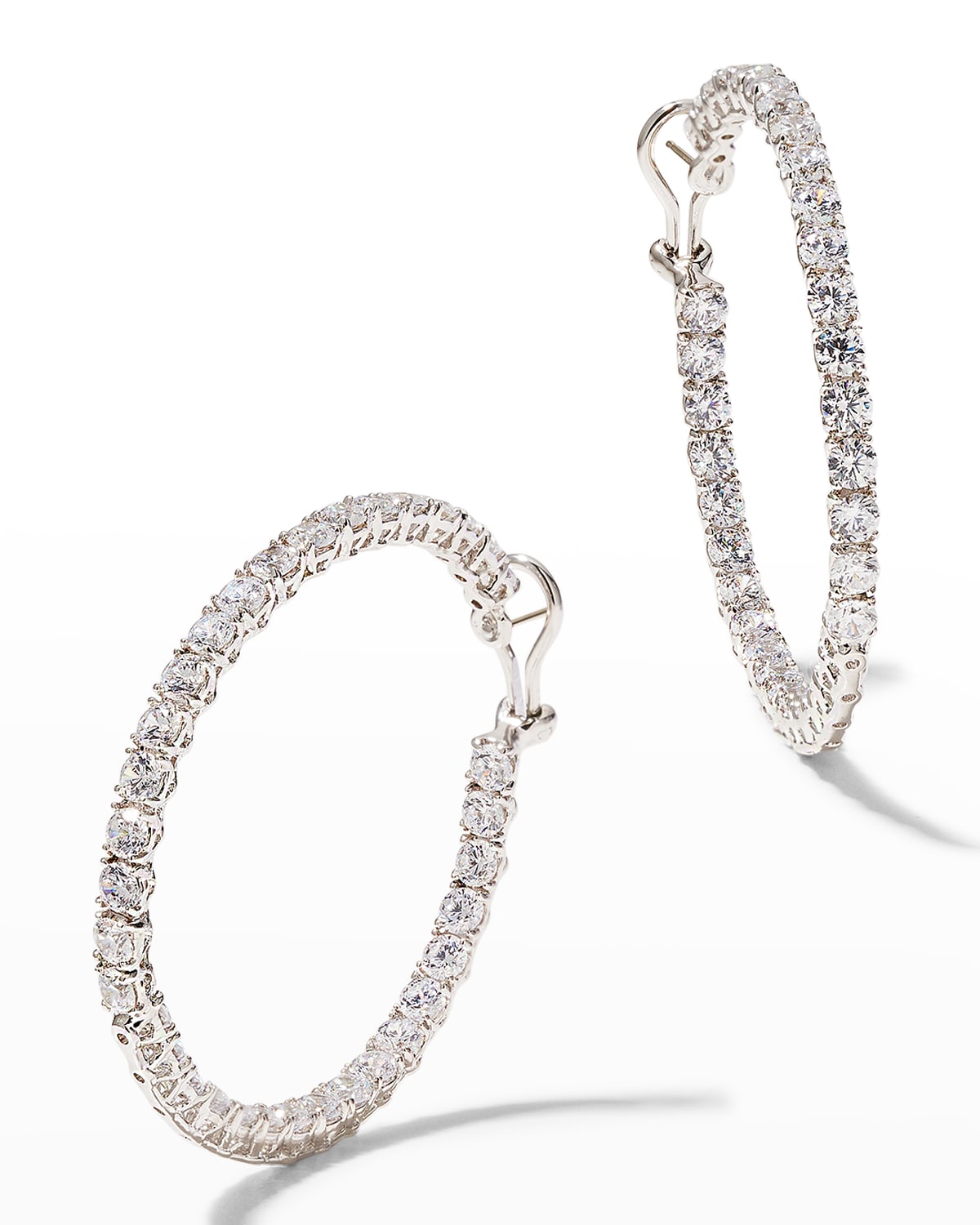 Fantasia by DeSerio extralarge hoop earrings. 18karat gold plating over sterling silver with palladium finish. Cubic zirconia at hoop interior and exterior. Omega backs for pierced ears. Made in USA.