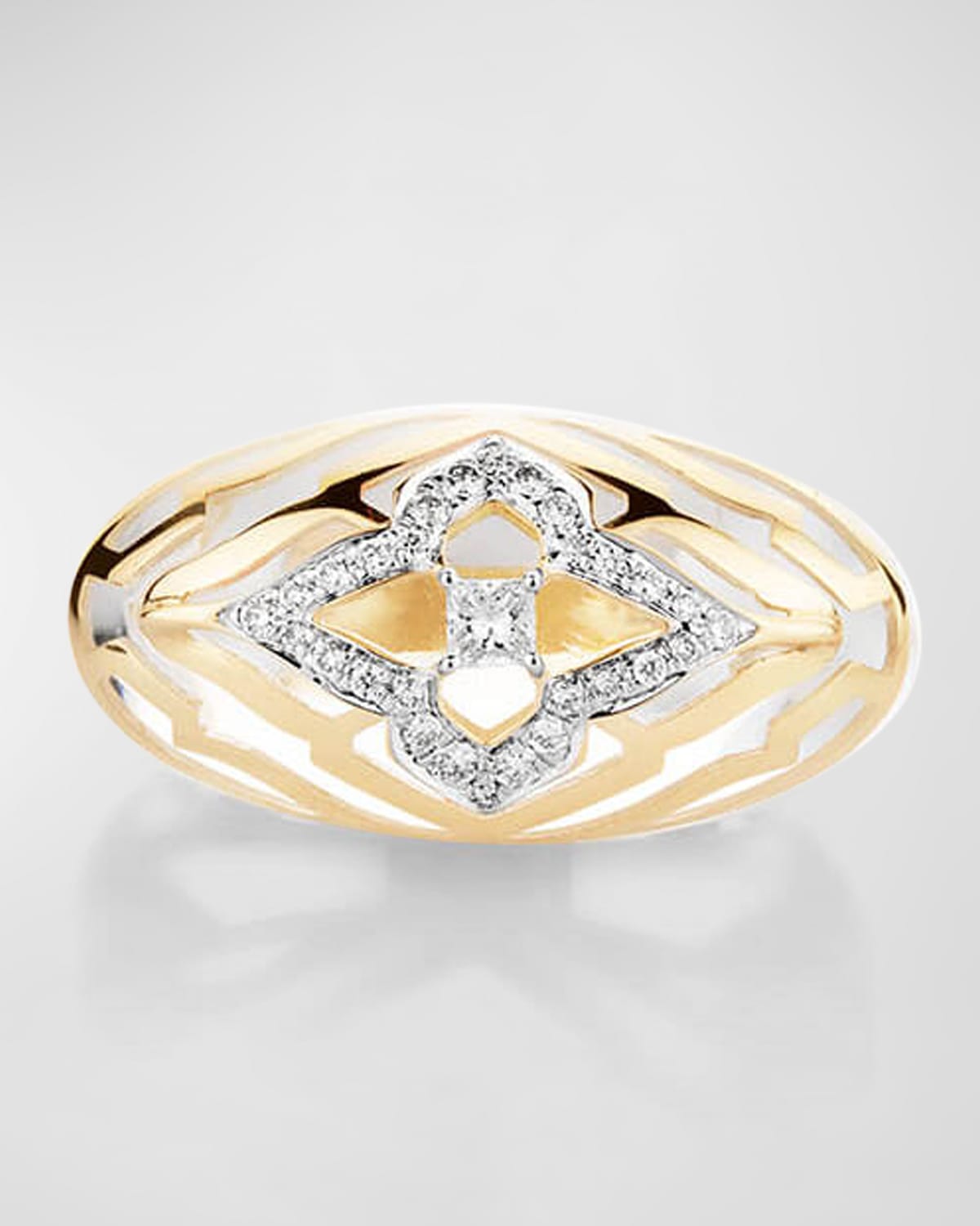 Farah Khan Atelier ring Approx. size 7; 0.98" long x 0.55" wide Shiny 18karat yellow gold White diamonds and clear ceramic Diamond total carat weight: 0.29 Slipon style Imported