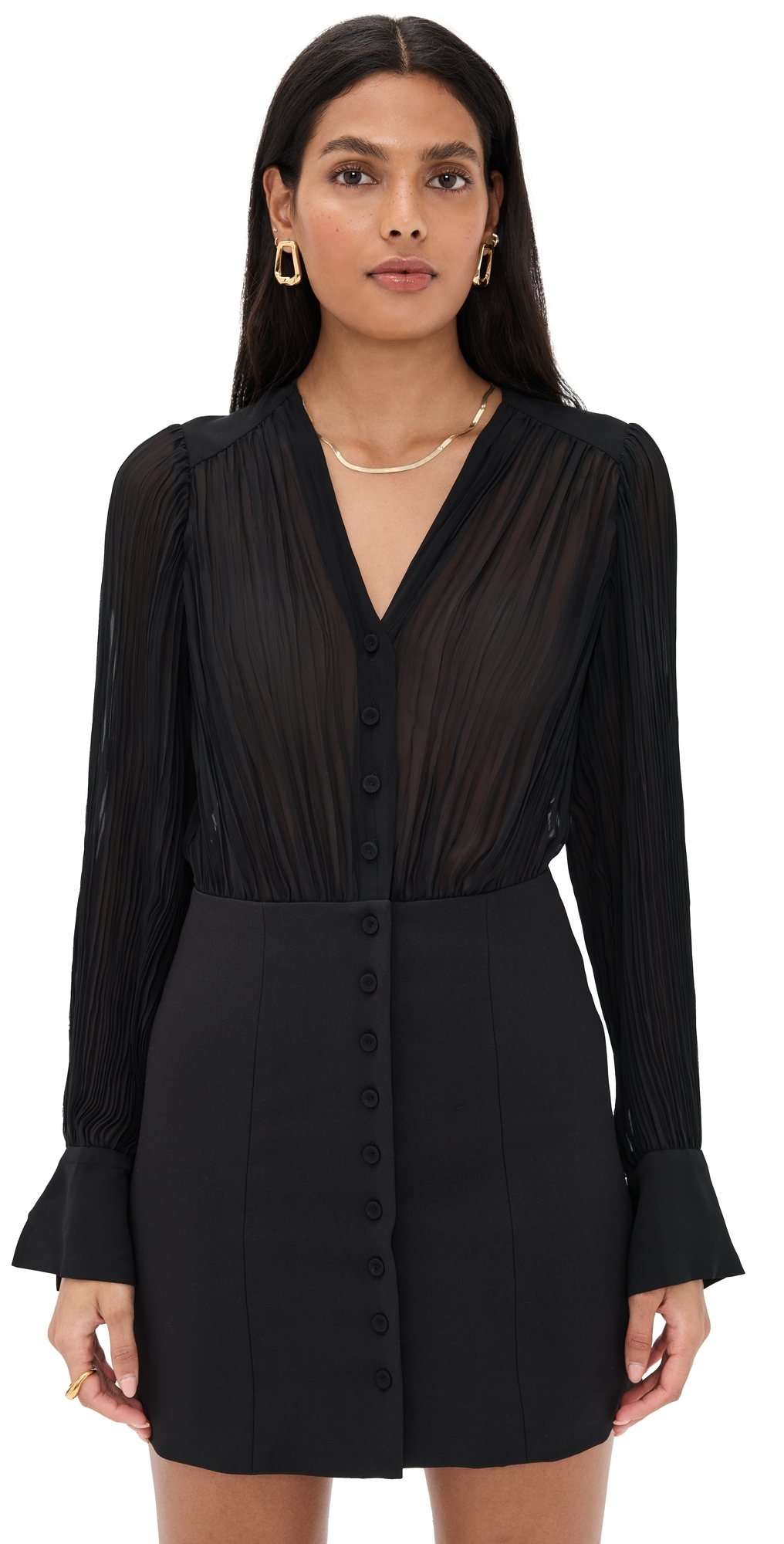 Fabric: Lightweight, non-stretch crepe suiting. Semi-sheer pleated chiffon bodice. Mini length. V neck. Long sleeves with button cuffs. Button placket. Shell: 100% polyester. Unlined bodice, lined skirt. Lining: 100% polyester. Hand wash or dry clean. Imported, China. Measurements: Measurements from size 0 Length: 30.75in / 78.0cm, from shoulder