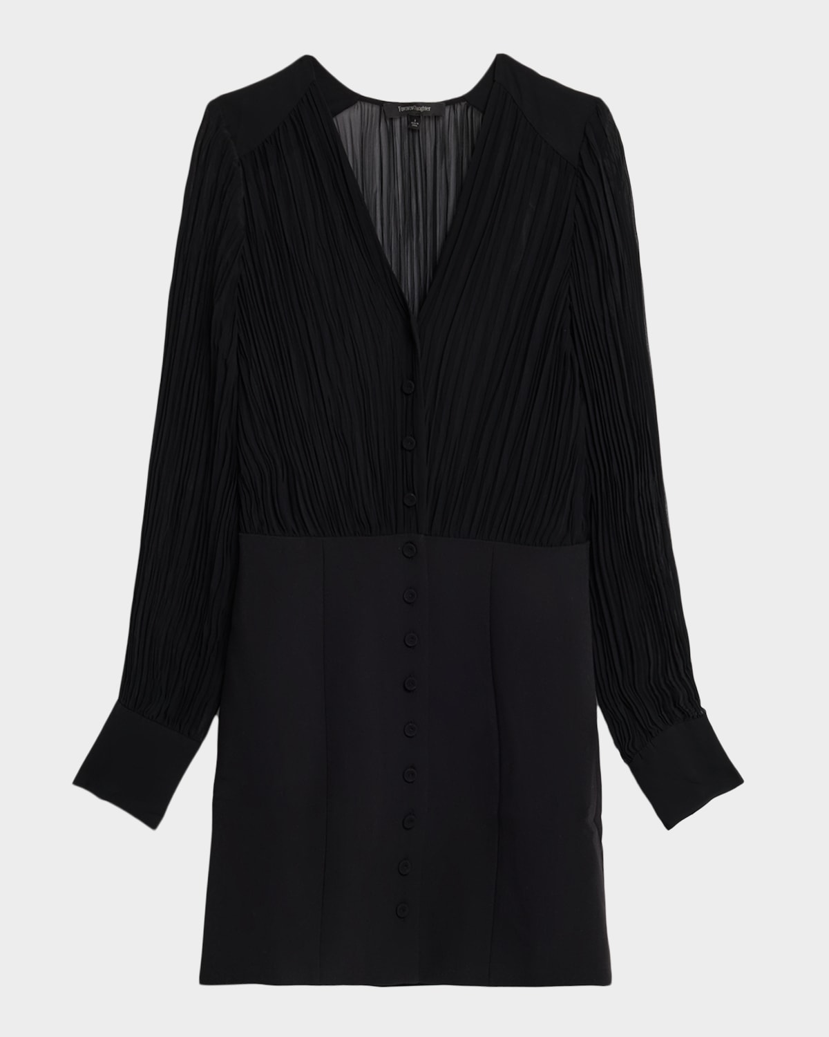 Cut from soft, silky satin with pleated details, the "Change Me" mini dress by Favorite Daughter provides an effortless, weareverywhere look Approx. 34.5"L from shoulder to hem Low buttoned V neckline Full long sleeves; button cuffs Hem falls above the knee Bodycon fit Button front closure Polyester Imported