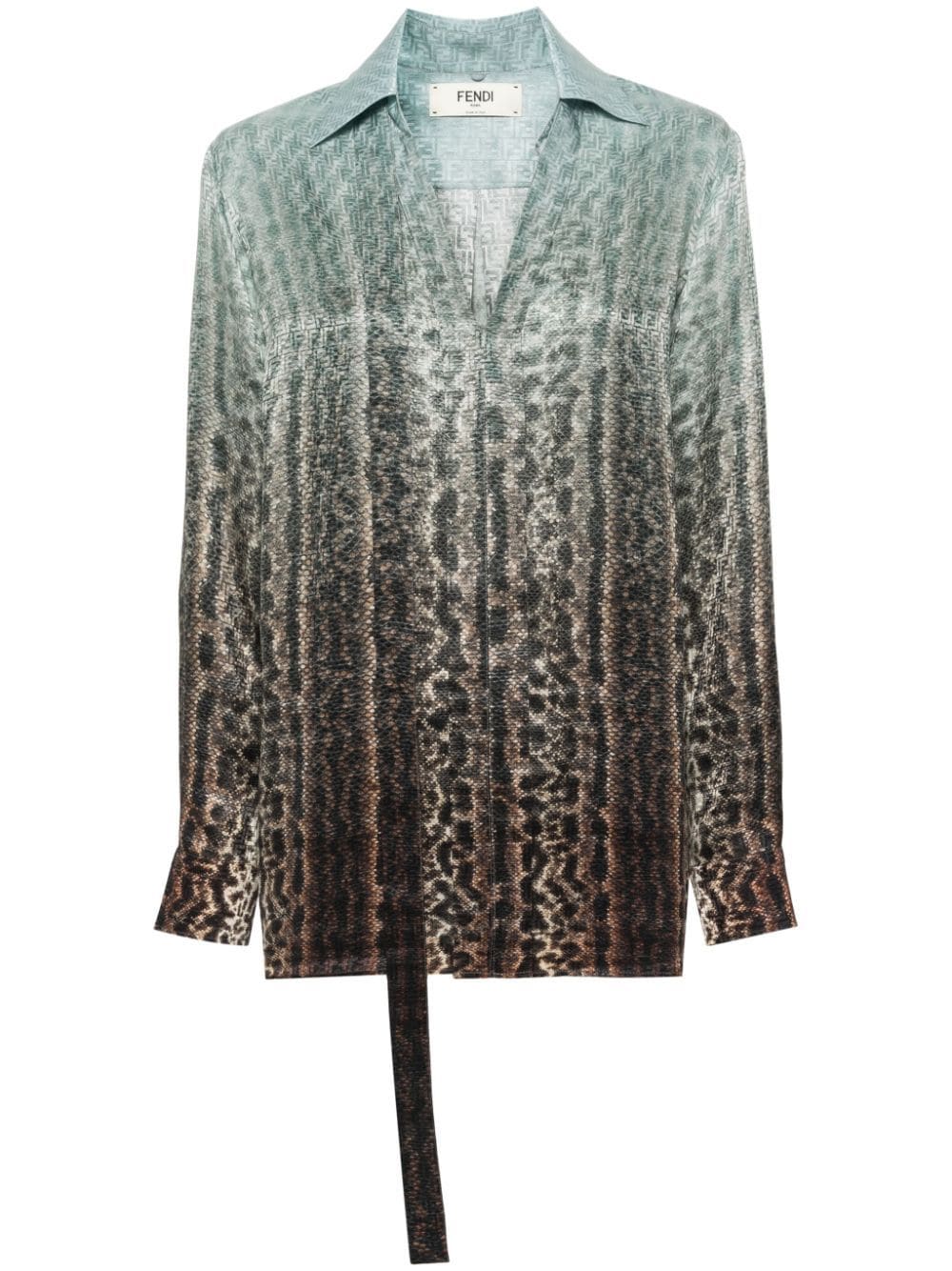 pale blue silk satin weave FF motif animal print gradient effect spread collar V-neck scarf detailing long sleeves with buttoned cuffs short side slits