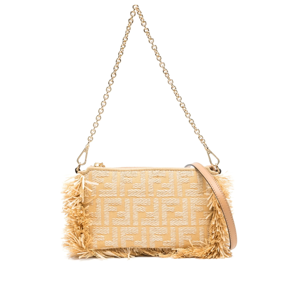 beige Zucca-patterned fabric fringe detailing zip closure chain shoulder strap