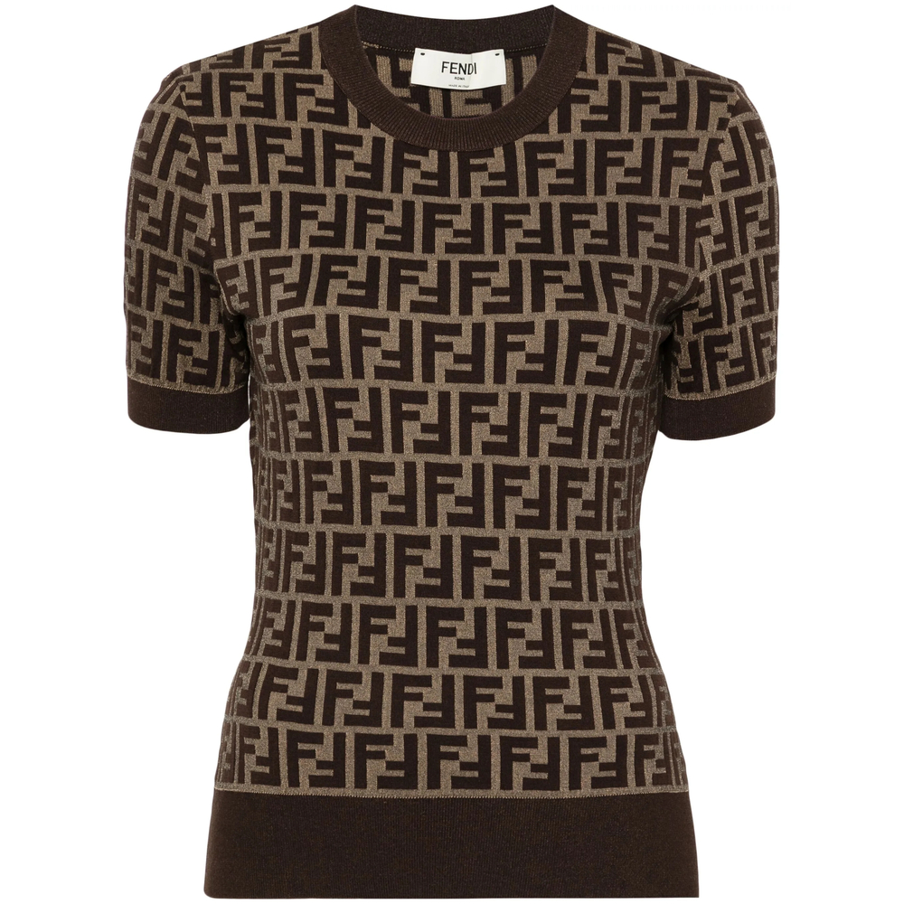 tobacco brown cotton blend knitted construction FF motif crew neck short sleeves straight hem