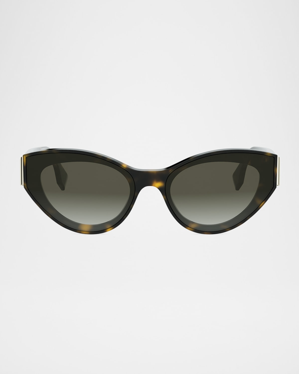 Fendi "Fendi First" sunglasses in Dark Havana acetate, embellished with the line's signature oversized, diagonal metal F motif at the temples Lens/bridge/temple (in mm): 6215140 Cateye frames Gradient lenses Acetate nose pads Wide, tapered arms 100% UVA/UVB protection Made in Italy