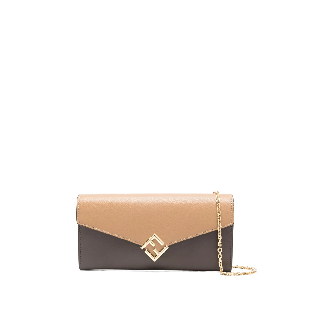 brown foldover top chain-link detailing internal zip-fastening pocket partitioned compartment