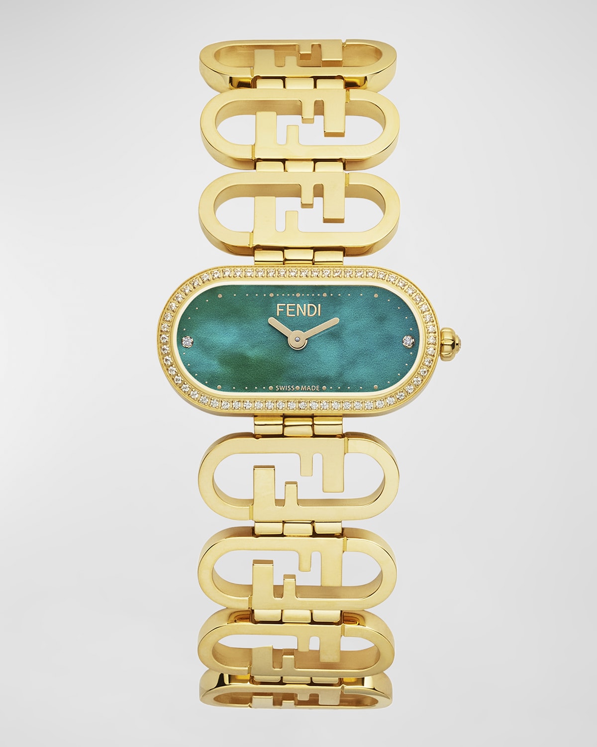 Fendi watch featuring an oval case in goldtone stainless steel Case dimensions: approx. 28mm Malachite or tiger's eye dial with two diamonds Bezel decorated with pavéset diamonds Bracelet strap with signature FF links Total carat weight: 0.18 Twohand movement Folddown closure Made in Italy