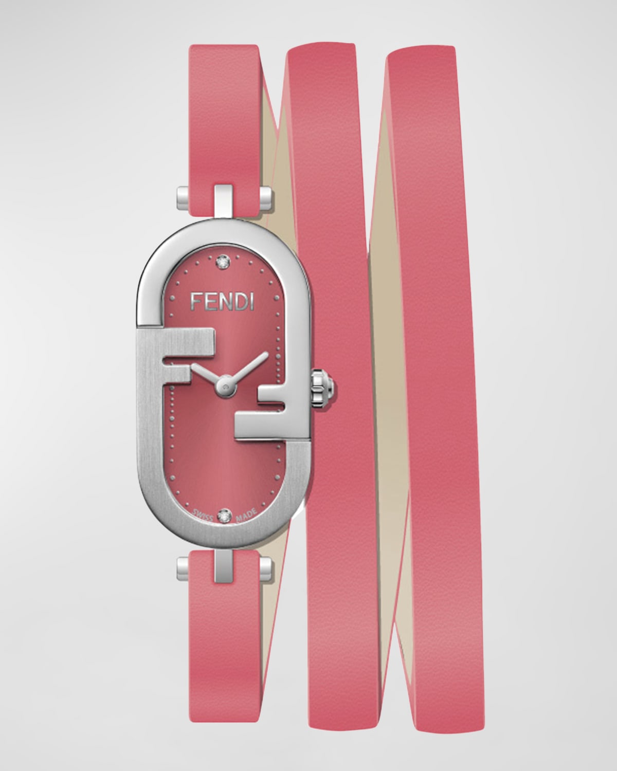Fendi "O'Lock" watch featuring a stainless steel vertical oval case White dial with two diamonds Bezel with signature FF motif Calf leather wraparound strap Total carat weight: 0.01 Twohand movement Adjustable length Thorn buckle Made in Switzerland