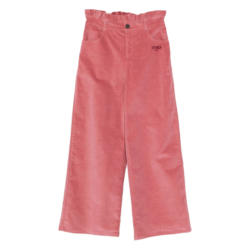pink corduroy texture ruffled waistband front diagonal pockets back patch pockets button closure