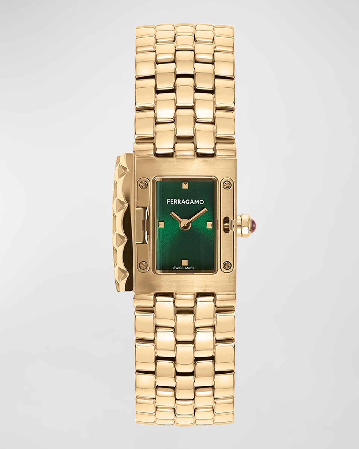 Ferragamo Secret watch with a hidden dial Case dimensions: approx. 18.5x30mm Approx. 6.8" length x 0.4" width Golden ionplated stainless steel case Green sunray dial with four stud indices Bracelet strap with a deployant buckle Twohand quartz movement Spot clean Made in Switzerland