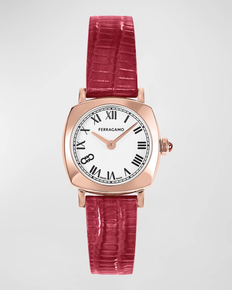 Ferragamo timepiece Approx. 23mm square case Rosy goldtone plating over stainless steel White enamel dial with Roman numerals Logo text at 12 o'clock; Gancini logo at 8 o'clock Embossed calf leather strap with thorn buckle Twohand quartz movement Water resistant to 3 ATM Sapphire crystal window Adjustable length Spot clean Made in Switzerland