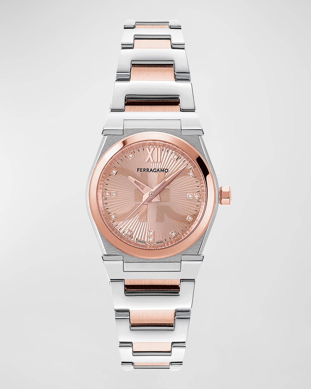 Ferragamo timepiece Approx. 28mm twotone case Rosy goldtone plating over stainless steel Guilloché dial with a golden pink finish Features the signature Gancini logo at center Roman numeral and logo text at 12 o'clock Time markers with 14 white diamonds Twotone bracelet strap with a deployant buckle 0.03 diamond total carat weight Threehand quartz movement Water resistant to 3 ATM Sapphire crystal window Spot clean Made in Switzerland