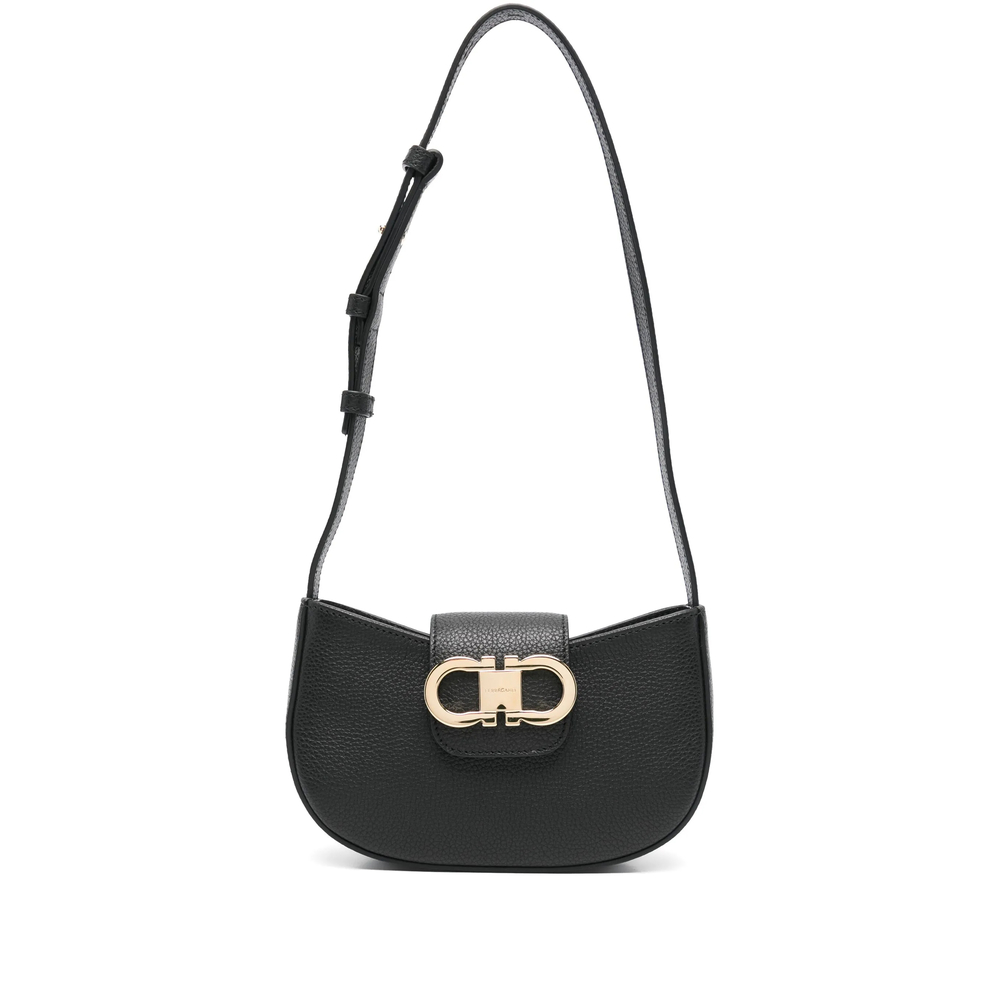 black foldover top with magnetic fastening top zip fastening adjustable shoulder strap Gancini plaque
