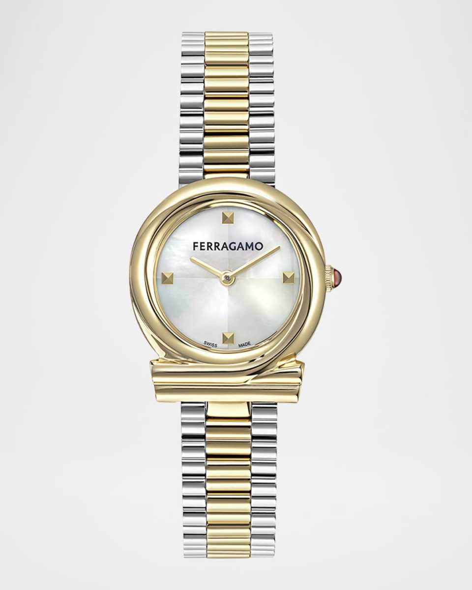 Ferragamo bracelet watch Approx. 6.5" length x 0.6" width Case dimensions: approx. 28mm Shiny twotone stainless steel Motherofpearl dial with four indices Threelink bracelet strap; butterfly closure Twohand quartz movement Water resistant to 3 ATM Sapphire crystal window Spot clean Made in Switzerland
