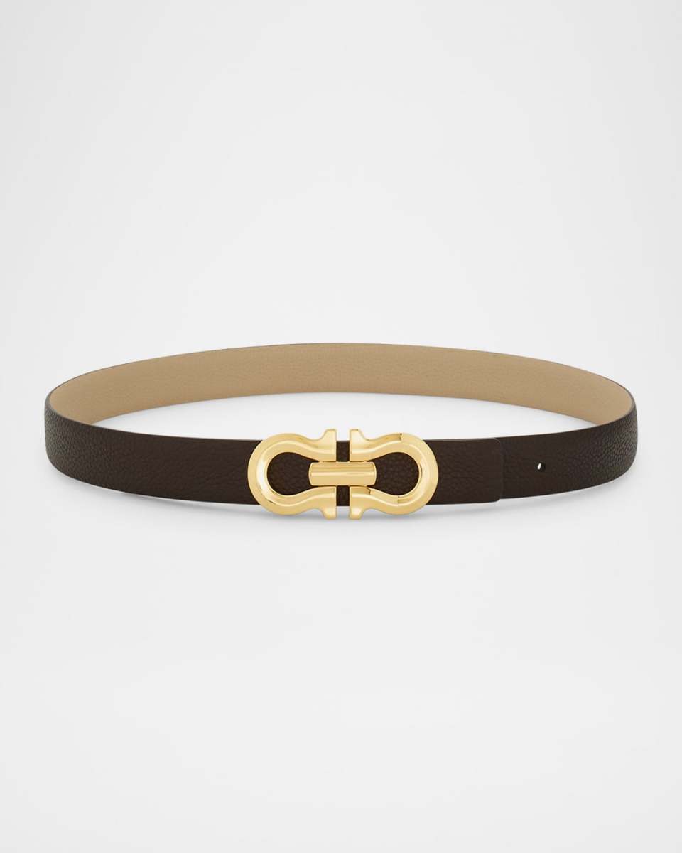 Ferragamo reversible belt in hammered calf leather Approx. 40"L x 1.0"W The adjustable length allows for a more personalized fit and style. Easily cut the belt strap or punch another hole for a tighter or looser fit Contoured goldtone double Gancio buckle Leather Made in Italy
