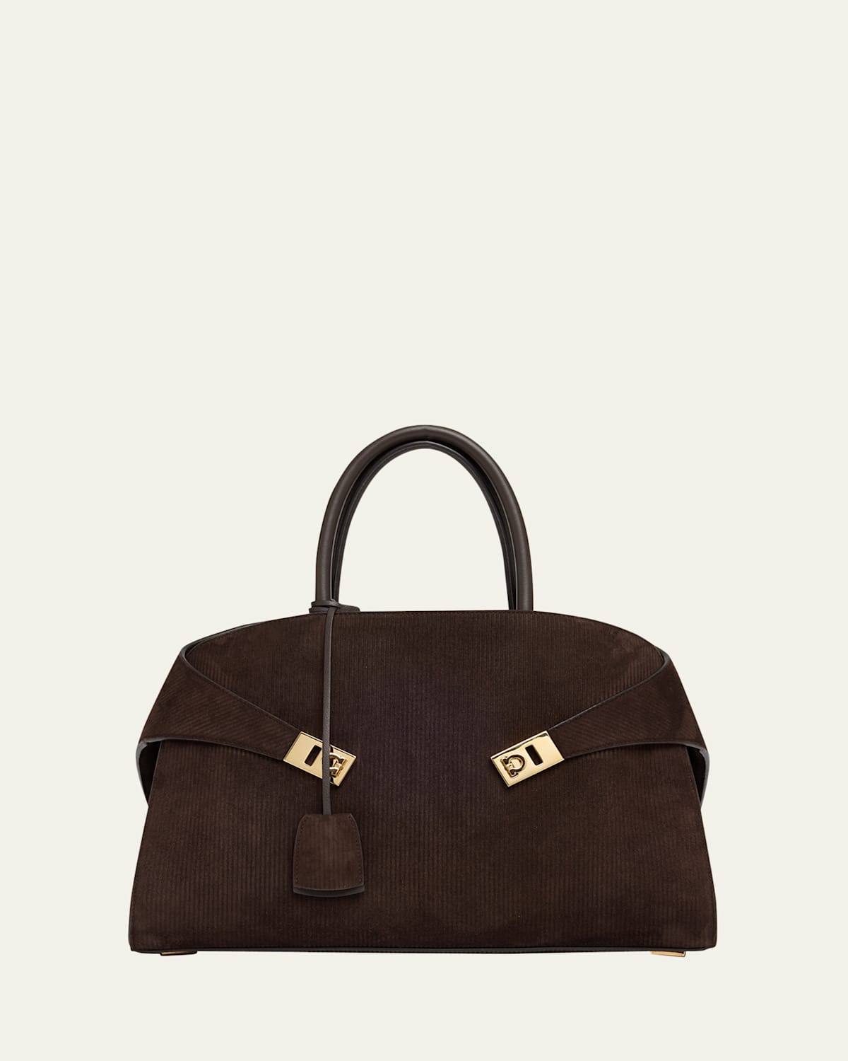 Ferragamo "Hug" shoulder bag in suede corduroy and leather Rolled shoulder straps with keyring tag Open top with side Gancini buckles and toggle closure Interior, one zip pocket Lining: Leather Feet protect bottom of bag Approx. 9.5"H x 15"W x 8.7"D Made in Italy