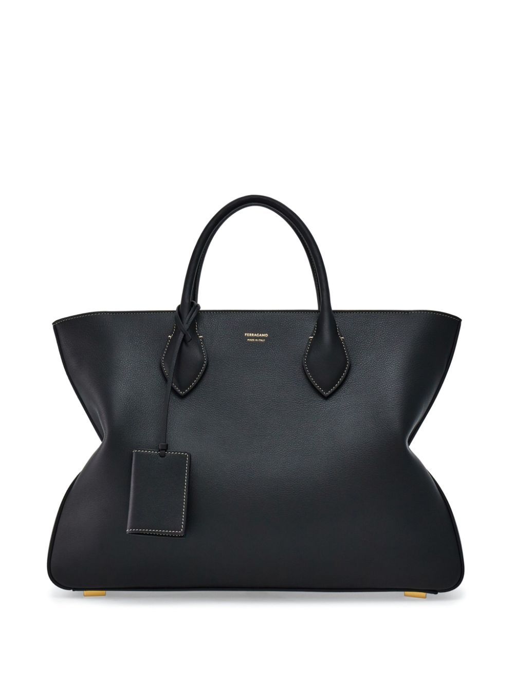 black calf leather smooth grain logo print to the front two rolled top handles luggage tag internal zip-fastening pocket main compartment