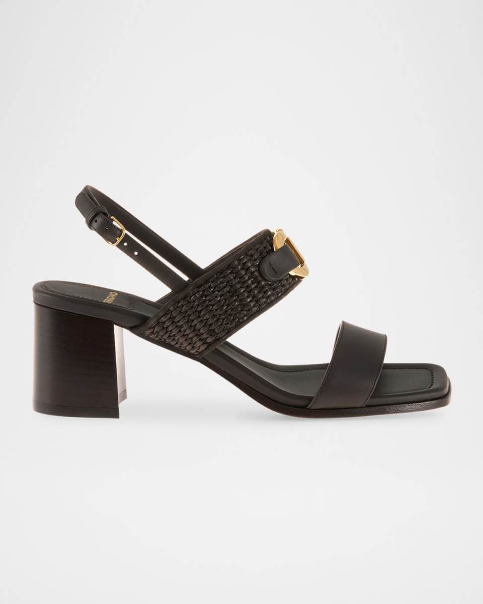 Ferragamo "Lou" sandals in leather and raffia with logo engraved Gancini bit strap 2.25 in / 55 mm block heel Open toe Two band upper Adjustable ankle strap Leather outsole Lining: Leather Professional cleaning recommended Made in Italy