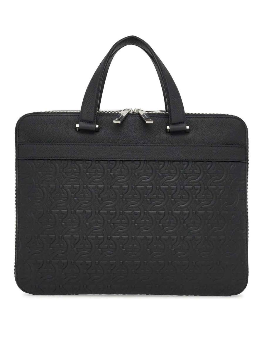 Noir de jais, texture grainée, motif monogramme gaufré, détails colorés, fermeture éclair bidirectionnelle, deux poignées supérieures, compartiment cloisonné, estampille du logo