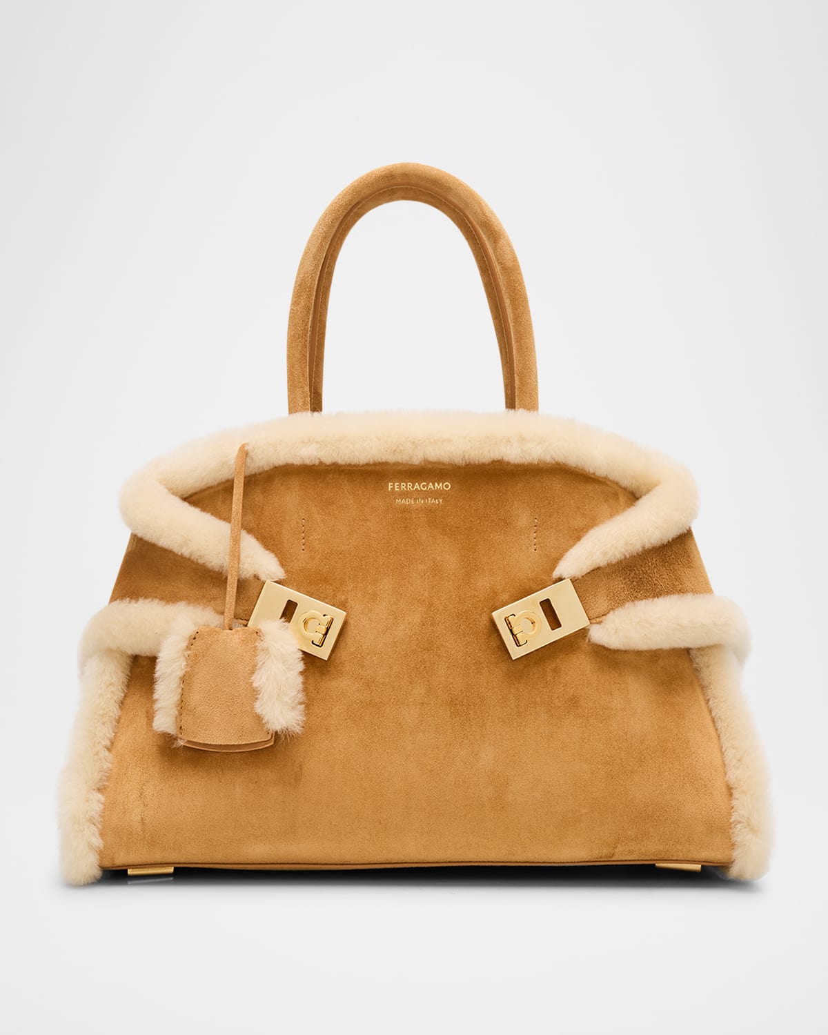 Ferragamo "Hug" suede and leather top handle bag with dyed sheep fur (Italy) trim Rolled top handles with keyring tag Detachable, adjustable crossbody strap Can be worn as a top handle or crossbody bag Open top with hook closure; side Gancini buckle straps Interior, one zip pocket Feet protect bottom of bag Approx. 8.7"H x 12.2"W x 7.5"D Made in Italy