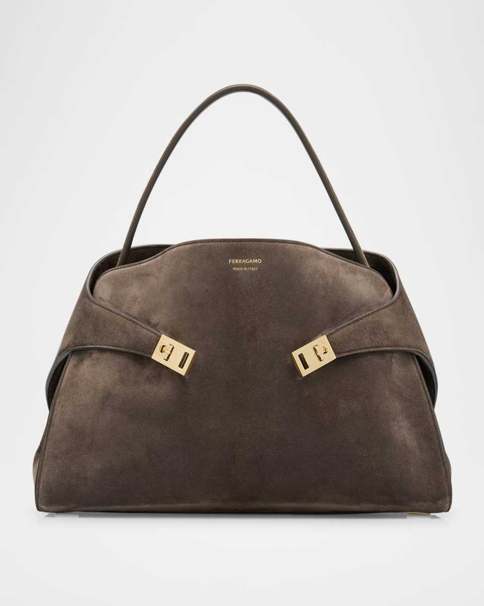 The Ferragamo "Hug" shoulder bag in calf suede combines sleek lines, goldtone hardware, and the brand's signature craftsmanship for a timeless, versatile accessory. Shoulder strap Foldover flap top with side Gancini clasp closures Center zip compartment divides interior; one slip pocket Leather lining Feet protect bottom of bag Approx. 12"H x 15.7"W x 5.9"D Made in Italy
