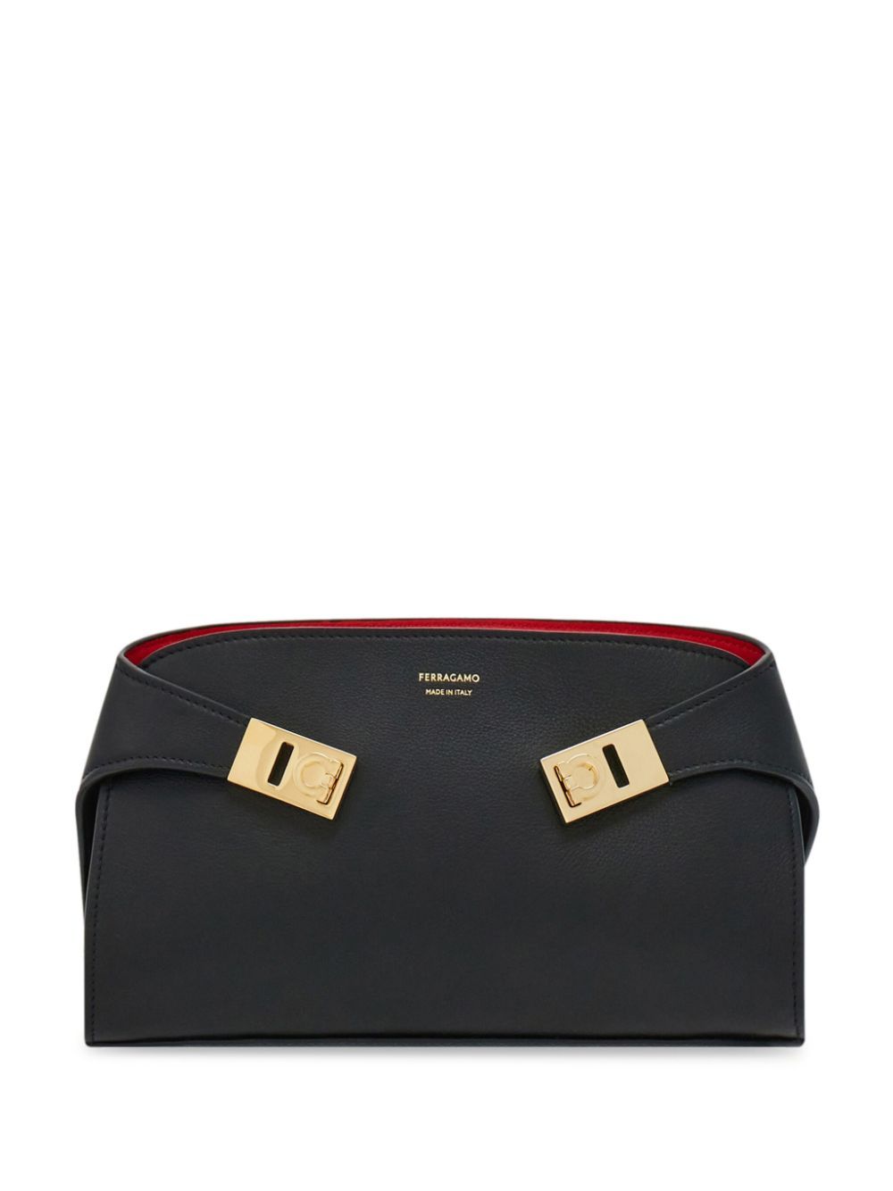 black calf leather logo stamp to the front adjustable detachable shoulder strap Gancini flip-lock fastening top zip fastening main compartment internal card slots internal logo stamp gold-tone hardware