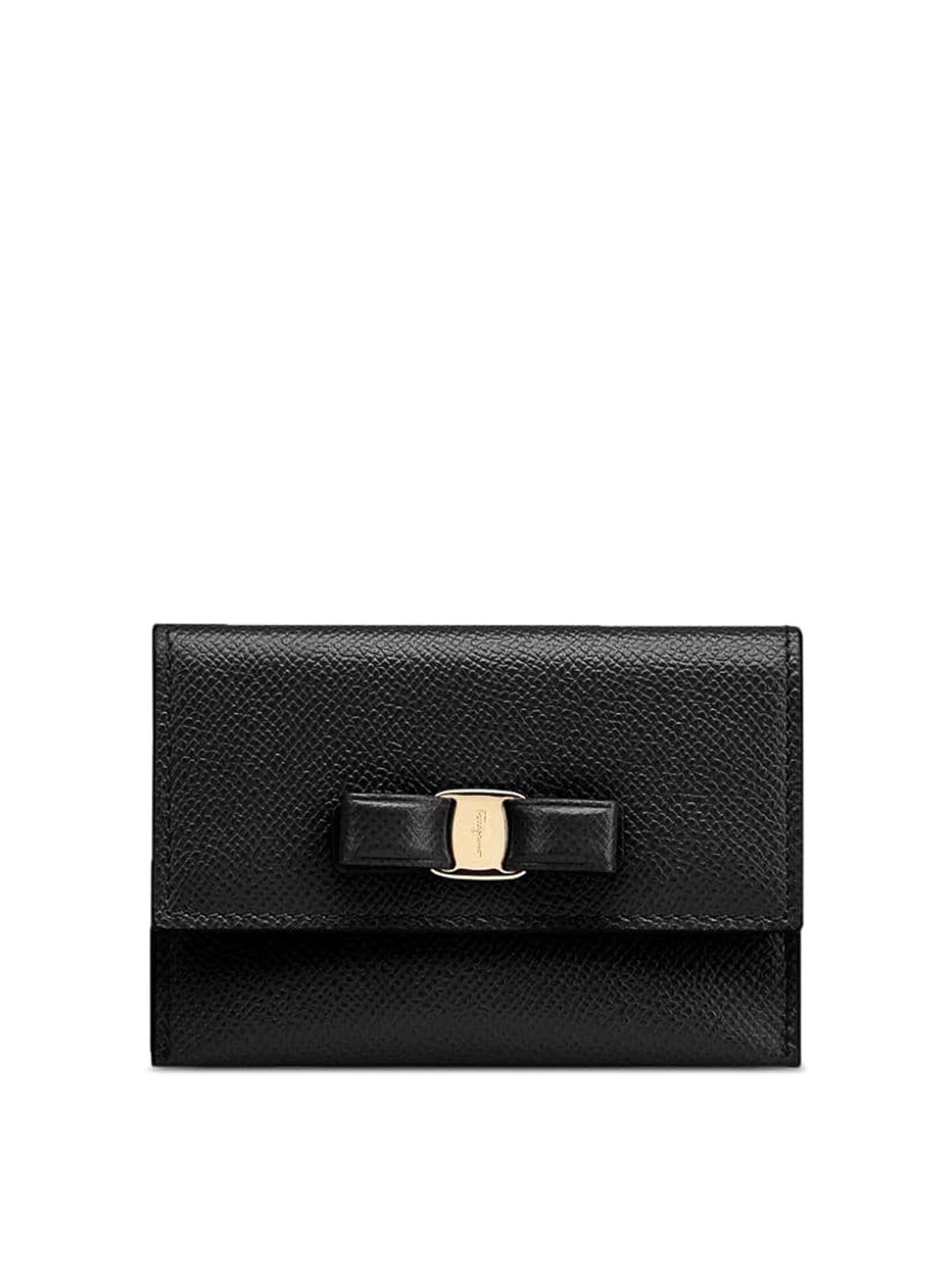 Portefeuille Vara à naud de Ferragamo, doté d'un haut dépliant à texture grainée noir de jais, de fentes pour cartes à bouton-pression et d'un logo estampillé