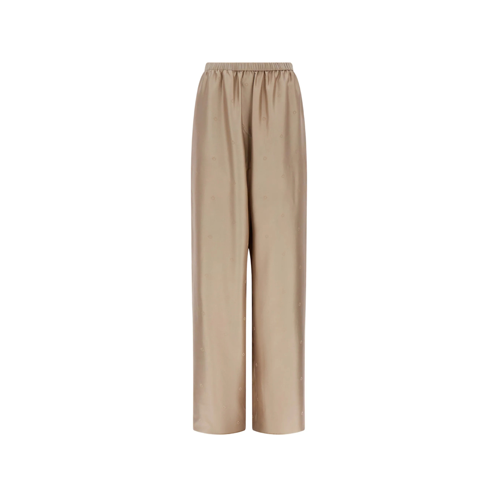 The relaxed allure of pajama pants infuses this jacquard silk twill trouser with a modern twist. The elastic waistband, faux zip, and flowing leg create a light, effortless elegance that one might refer to as contemporary chic. beige elasticated waistband