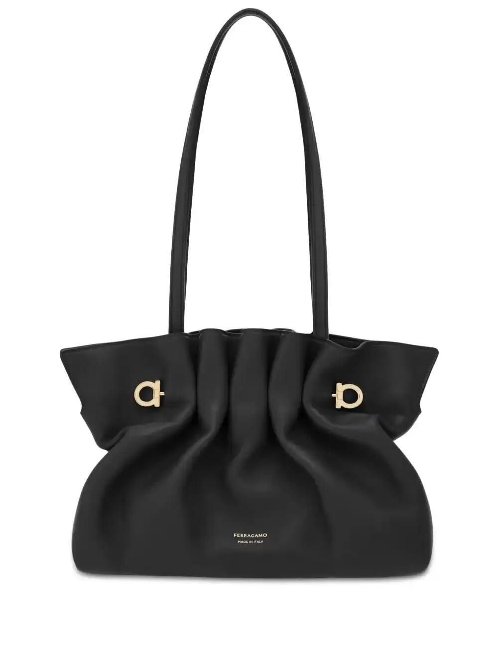 black logo stamp to the front concealed magnetic fastening gathered detailing two long top handles