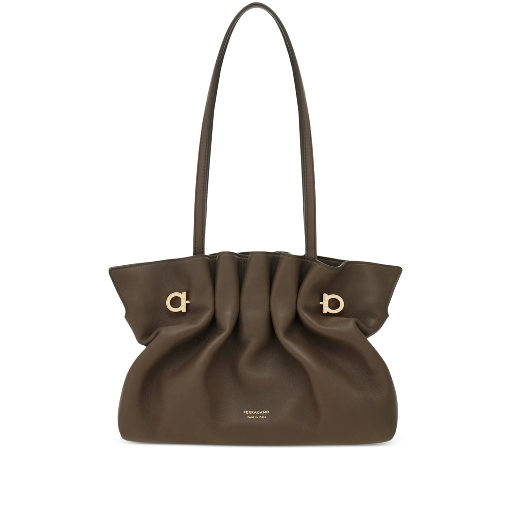 brown central ruching detail twin shoulder straps logo hardware accents spacious interior soft silhouette