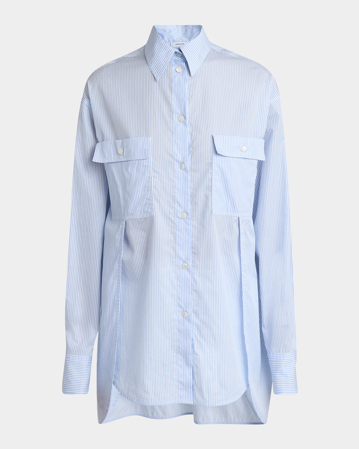Ferragamo shirt featuring a striped print and splice hem details Point collar; button front Long sleeves; button cuffs Chest button flap pockets Loose fit Tunic length Shirttail hem Viscose/nylon/polyamide Hand wash Made in Italy