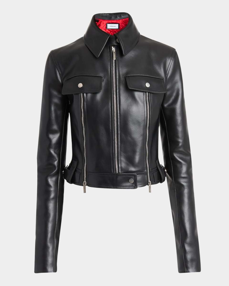Ferragamo calfskin leather trucker jacket featuring side zip details Point collar; twoway zip front Long sleeves; zip cuffs Chest snap flap pockets Slim fit Snaptab hem Leather Lining: Polyester Dry clean Made in Italy
