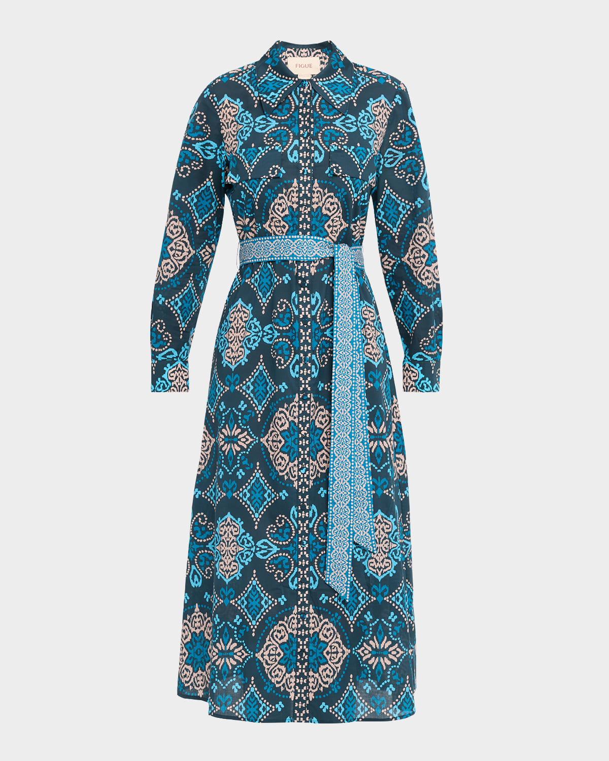 Figue "Bassa" shirtdress features a medallion print and is cinched at the waist with a contrasting waist sash Point collar; concealed button front Long sleeves; button cuffs Selftie belted waist Aline silhouette Hem falls below the knee Cotton Imported