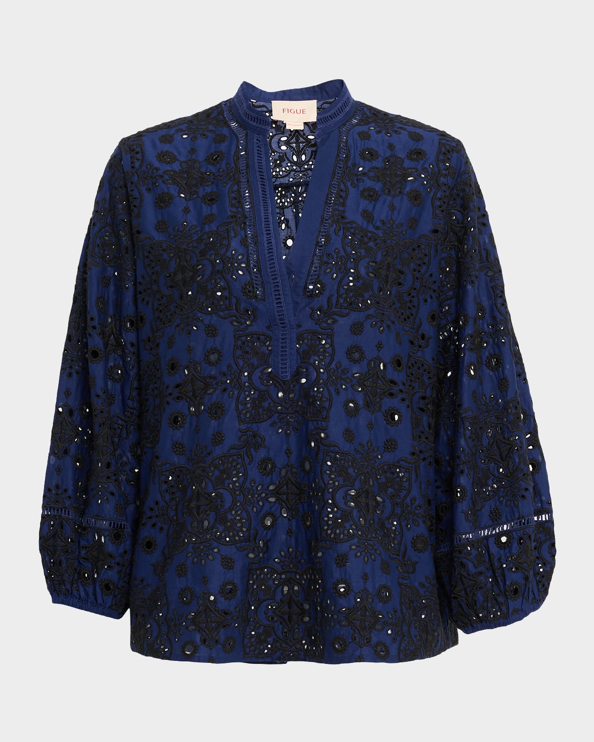 Figue "Rylie" peasant top is embellished in allover broderie anglaise and lattice insets Band collar; split V front Long blouson sleeves; elasticized cuffs Relaxed fit Pullover style Cotton Imported