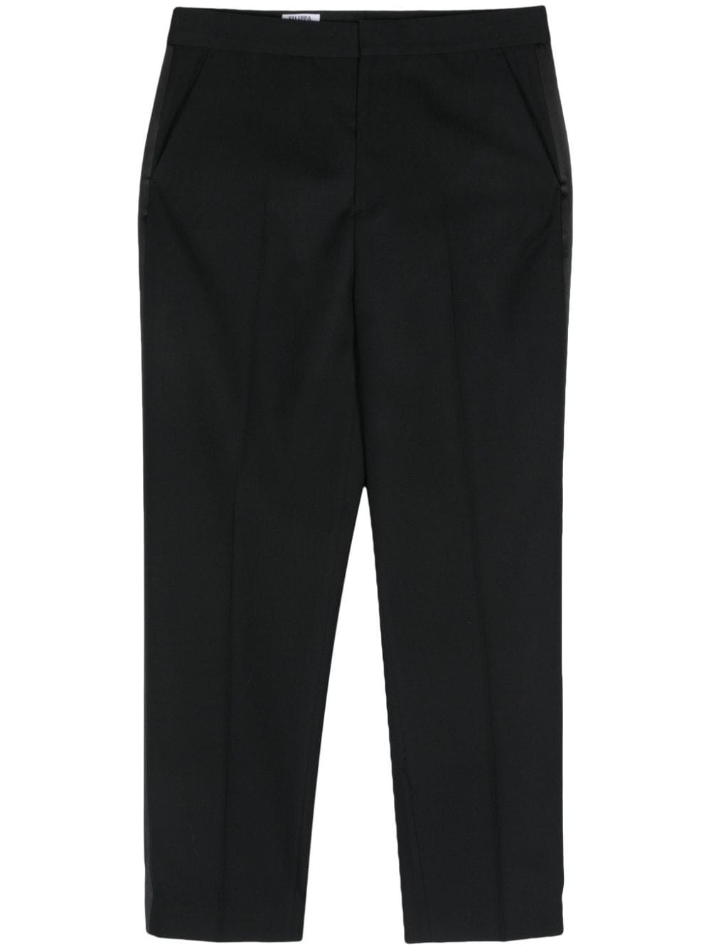 black wool gabardine weave tailored design low-rise tapered leg satin trim to the sides two side inset pockets pressed crease two rear button-fastening jetted pockets adjustable rear buckle-strap concealed front button, hook and zip fastening