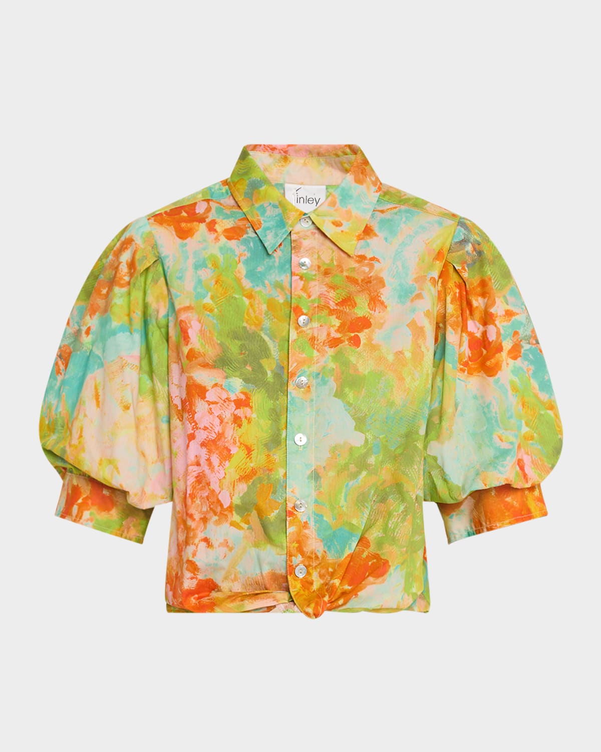Finley "Bomba" Monet floralprint top with front twist hem Approx. 21"L from shoulders to hem Point collar; button front Elbow blouson sleeves; approx. 13.5"L Boxpleated back yoke Relaxed fit Cotton Lining: Cotton Machine wash cold Made in the USA from imported materials