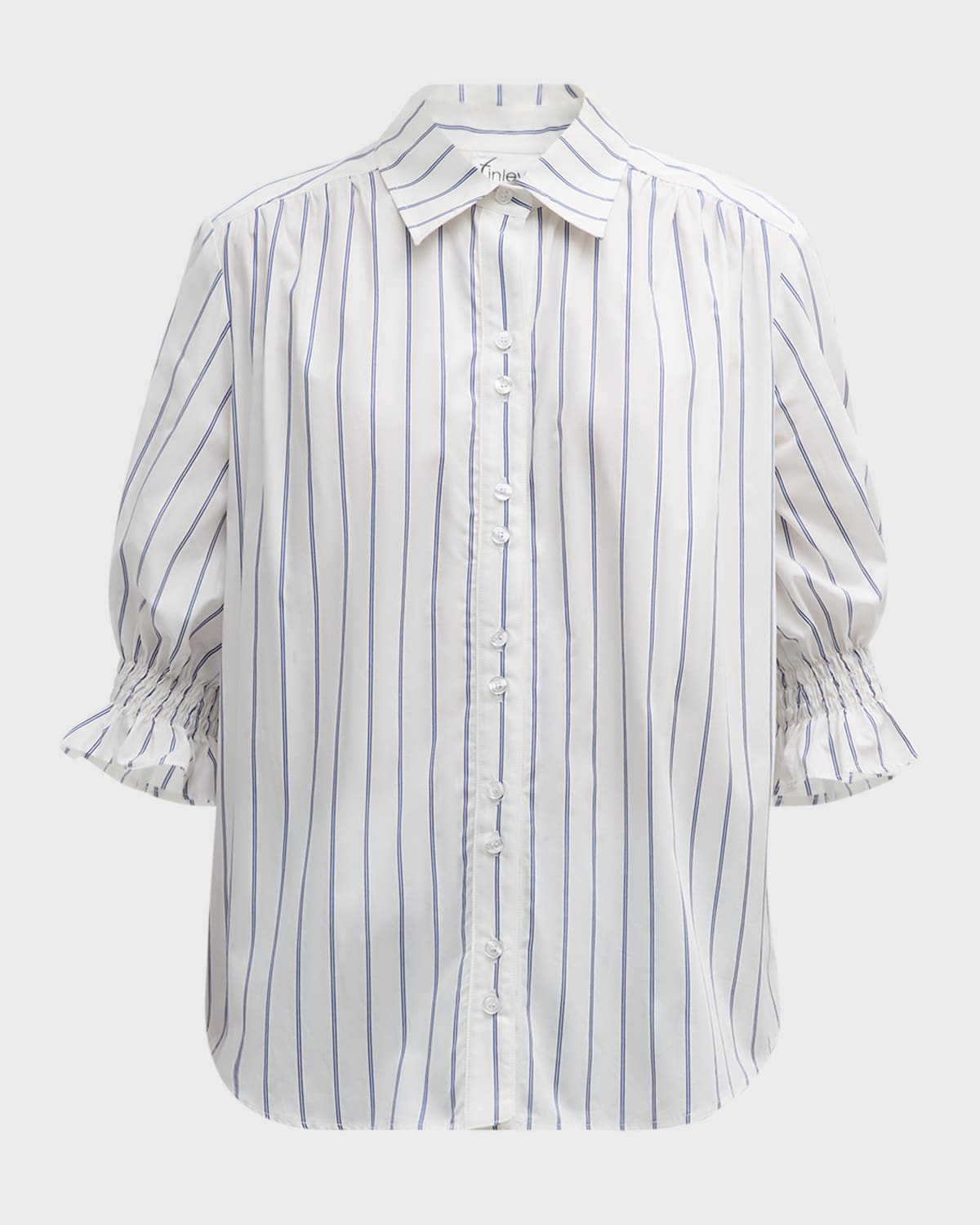 Finley "Sirena" shirt in cotton poplin with double pinstripes Approx. 29"L from shoulders to hem Spread collar; button front Elbow puff sleeves; approx. 16"L Ruched back yoke Shirttail hem Relaxed fit Cotton Unlined Machine wash cold Made in the USA from imported materials