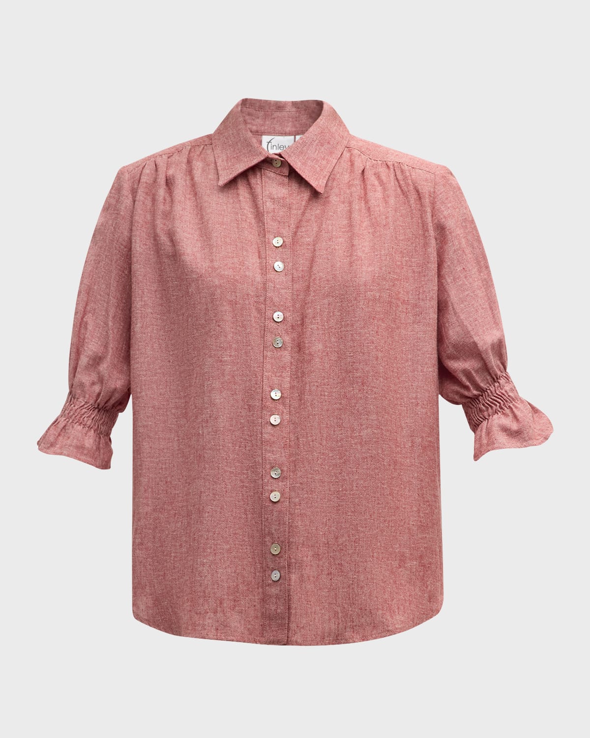 Finley "Sirena" shirt in a heathered hempcotton blend Approx. 28"L from shoulders to hem Spread collar; button front Elbow sleeves; approx. 16"L Ruched back yoke Shirttail hem Relaxed fit Hemp/cotton Unlined Machine wash cold Made in the USA from imported materials
