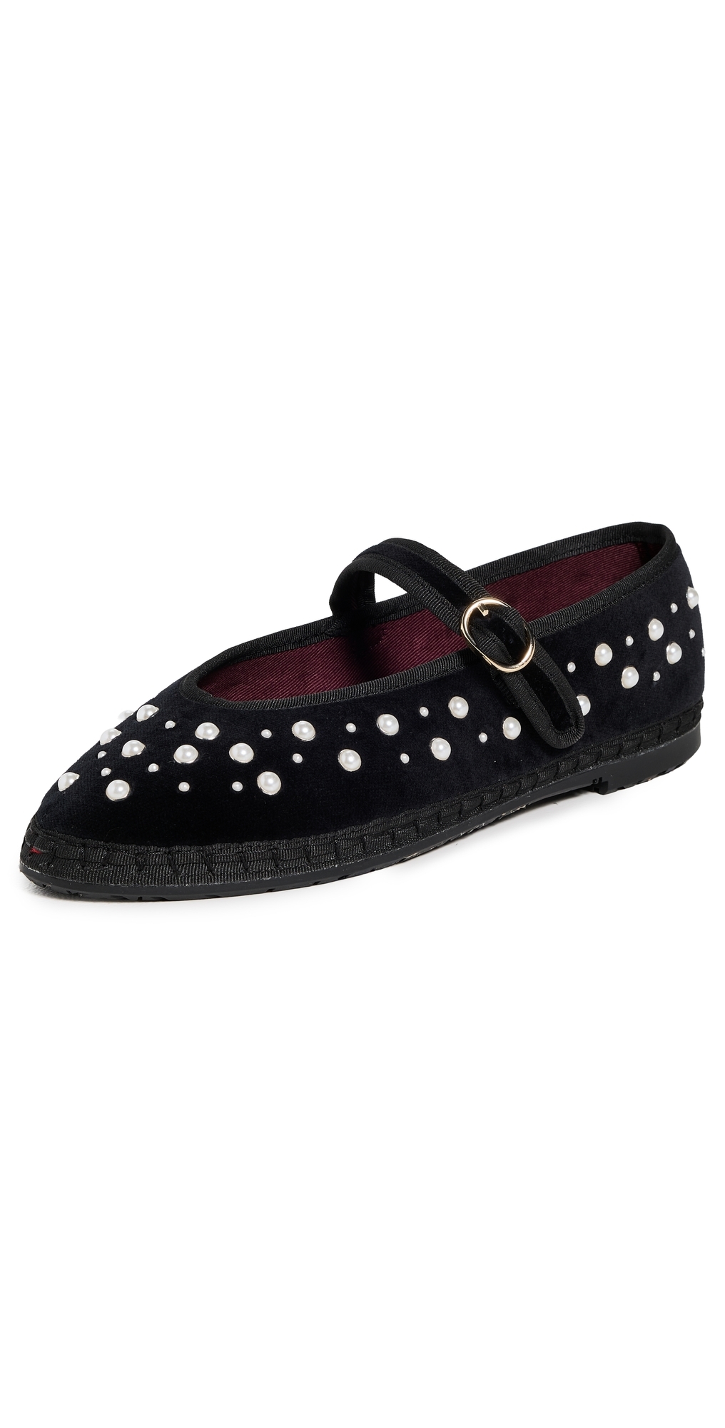 Upper: Velvet. Allover faux pearl embellishments. Cushioned footbed. Lining: Textile. Buckle strap. Round toe. Rubber sole. Made in Spain. This item cannot be gift-boxed.