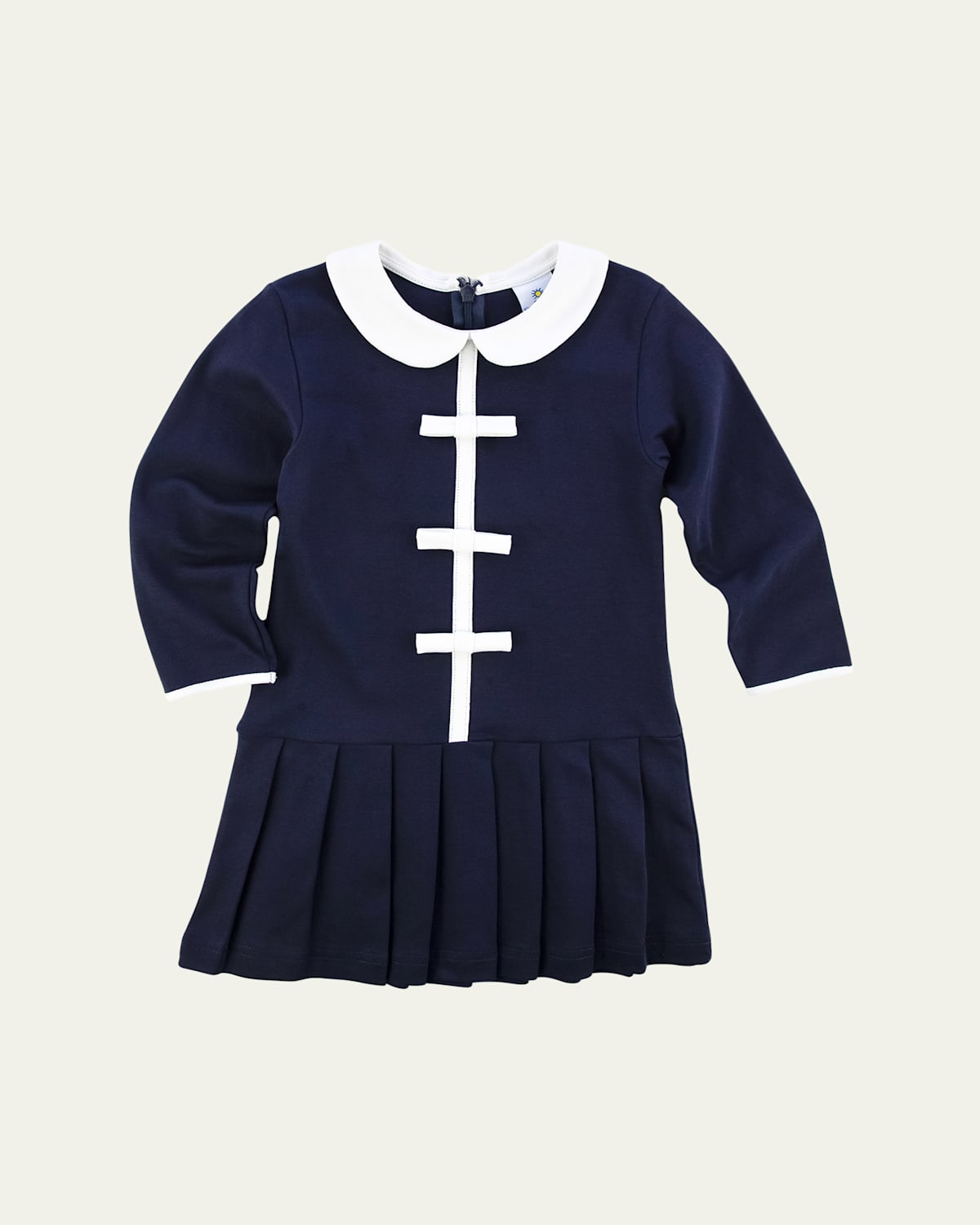 Florence Eiseman combo knit dress with pleated skirt Peter Pan collar Long sleeves Zip closure at back Drop waist Hem falls above the knee Slipover style Cotton Made in Peru
