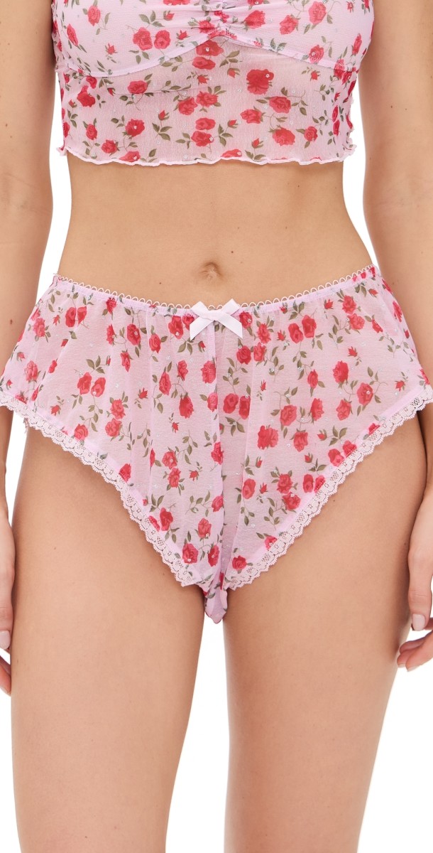 Fabric: Lightweight stretch mesh. Lace trim. Rose print and crystal embellishments. Sheer. Shell: 88% polyester/12% elastane. Hand wash. Imported, China. Measurements: Measurements from size S Rise: 10.75in / 27cm Inseam: 1.5in / 4cm